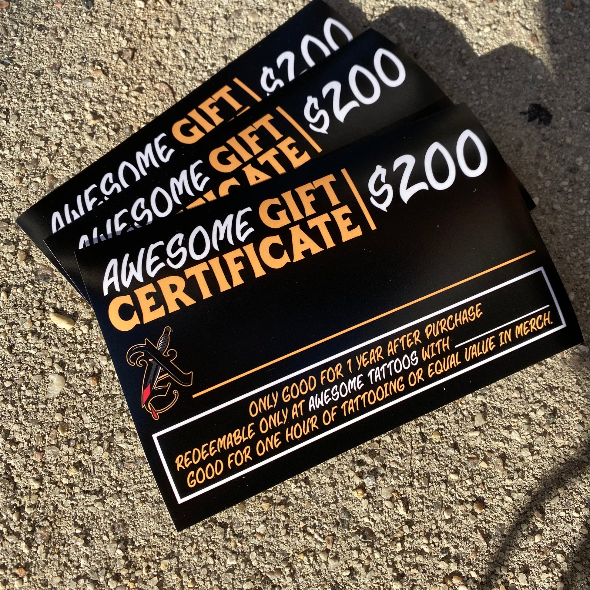 Gift cards need to be physically given to the tattoo artist in order to be redeemed. Gift cards are available only in $200 value.